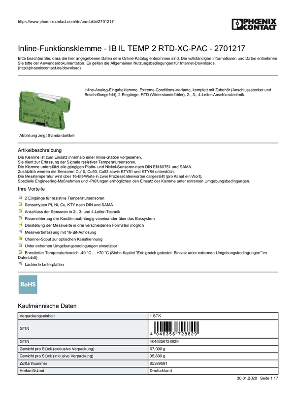 Phoenix Contact IB IL TEMP 2 RTD-XC-PAC 2701217 Zacisk funkcyjny 7.5 V/DC