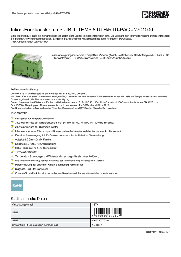 Zacisk funkcyjny Phoenix Contact IB IL TEMP 8 UTH/RTD-PAC 2701000, 1 szt.