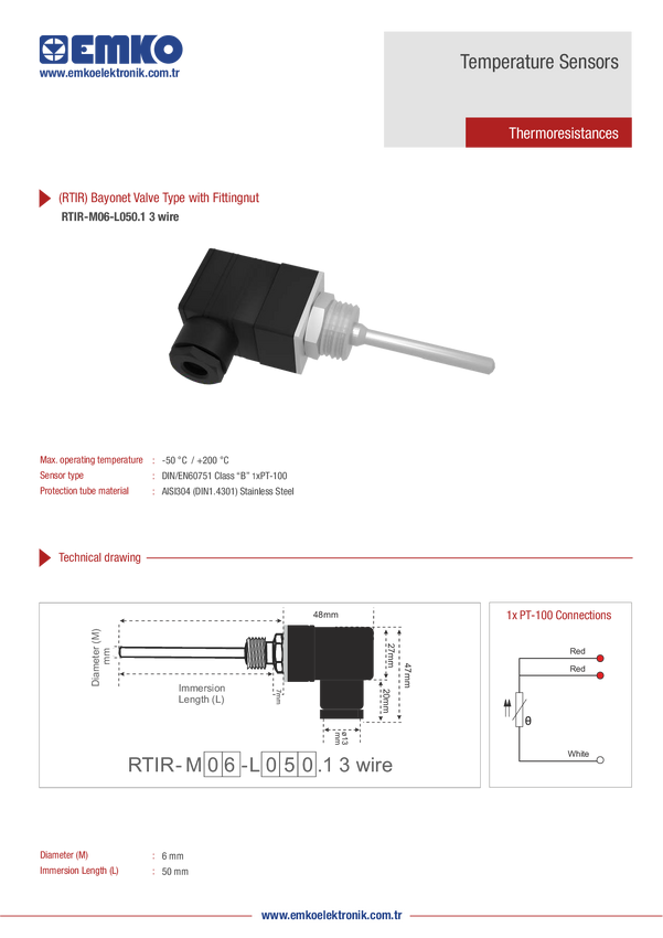 Emko Czujnik temperatury RTIR-M06-L050.1 3 wire (1000) Rodzaj czujnika Pt1000 Zakres pomiarowy temperatury-50 do +200