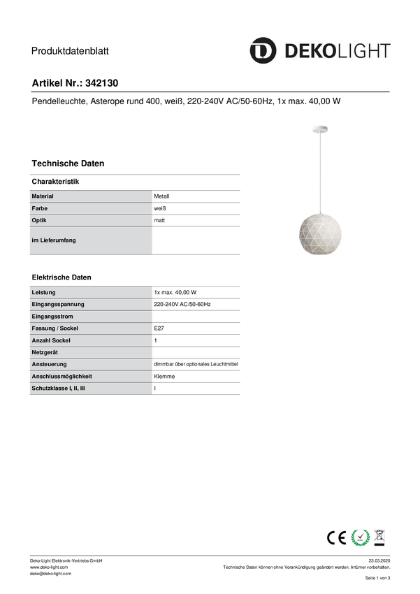 Lampa sufitowa, podwieszana Deko Light Asterope rund 500 342131 E-27 40 W biały