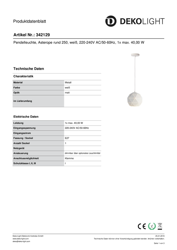 Lampa sufitowa, podwieszana Deko Light Asterope rund 250 342129 E-27 40 W biały