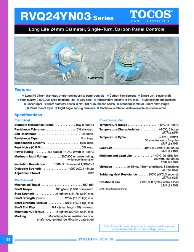 Potencjometr węglowy liniowy 24mm; bushing M9x0,75; P=0,25W; średnica 23,5mm; gł.11,5mm; ośka 6mm dł. 20mm; ścięta trwałość 2 M cykli; kąt el 280 st; wyprowadzenia z boku lin +-3% IP40; Rezystancja 5 kohm; niebieski; kąt.mech.300 st