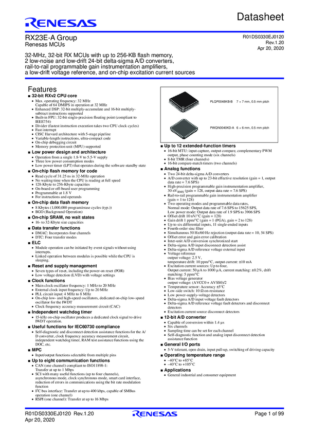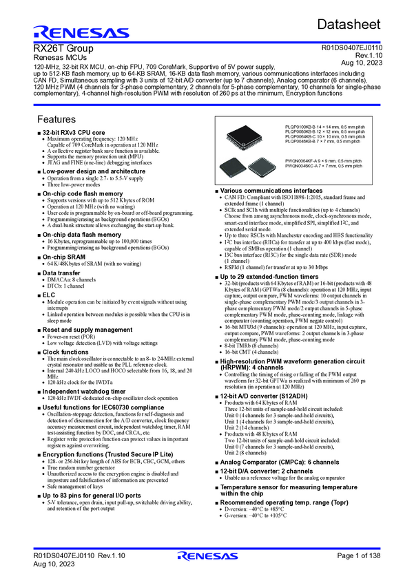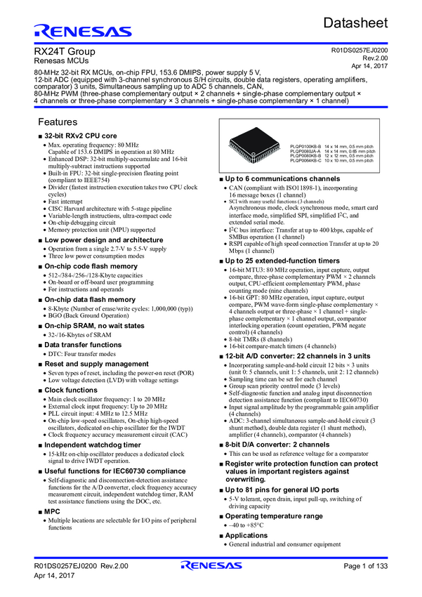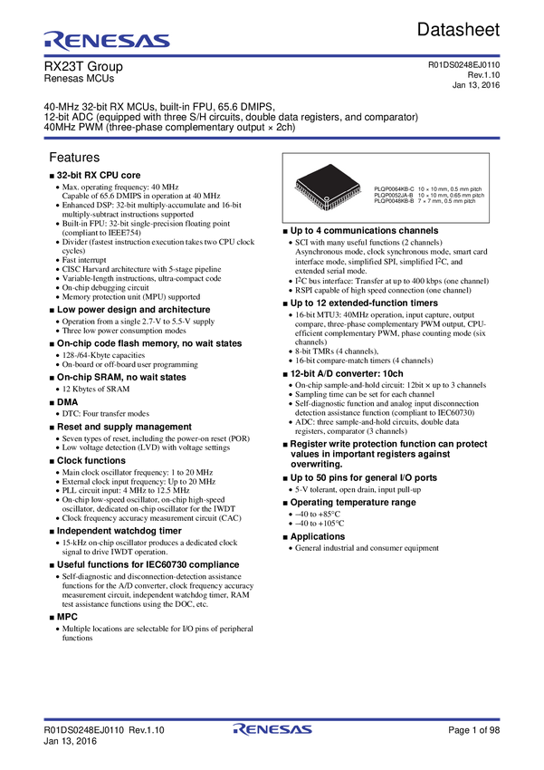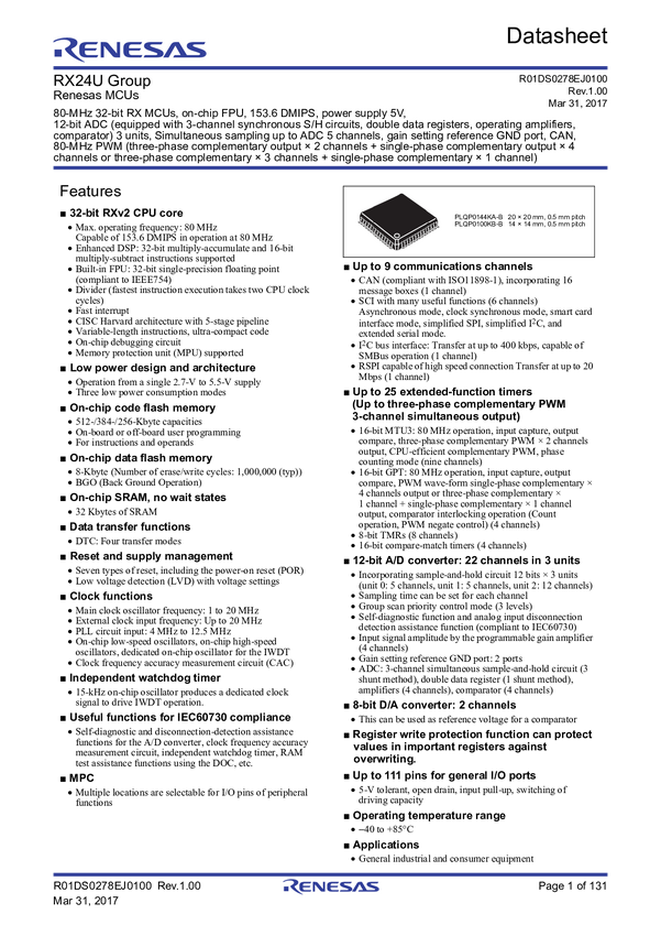 Low-power, High Performance Microcontrollers with 32-bit RXv2 CPU Core and Enhanced DSP and FPU