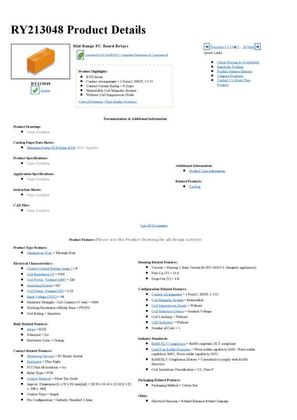 Electromechanical Relay SPDT 8A 48VDC 9.391KOhm Through Hole
