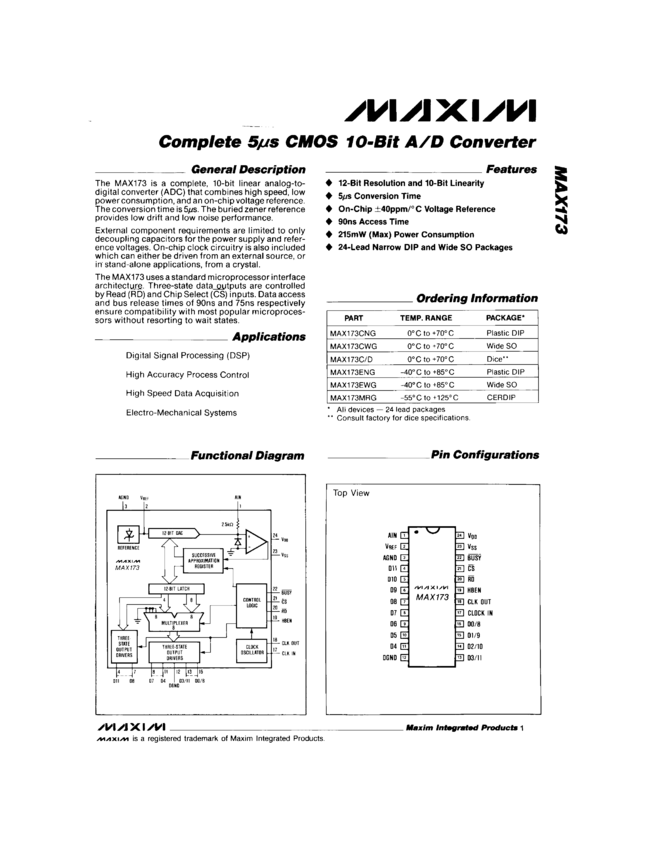 MAX173 CMOS, 5µs, 10-Bit ADC with Reference