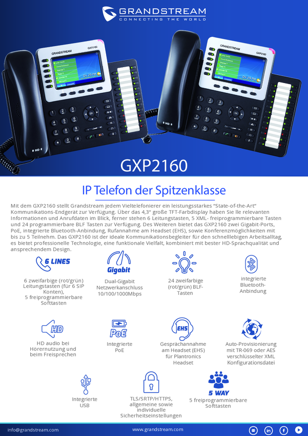 Grandstream GXP-2160 Telefon systemowy, VoIP Bluetooth, złacze zestawu słuchawkowego kolorowy czarny, srebrny