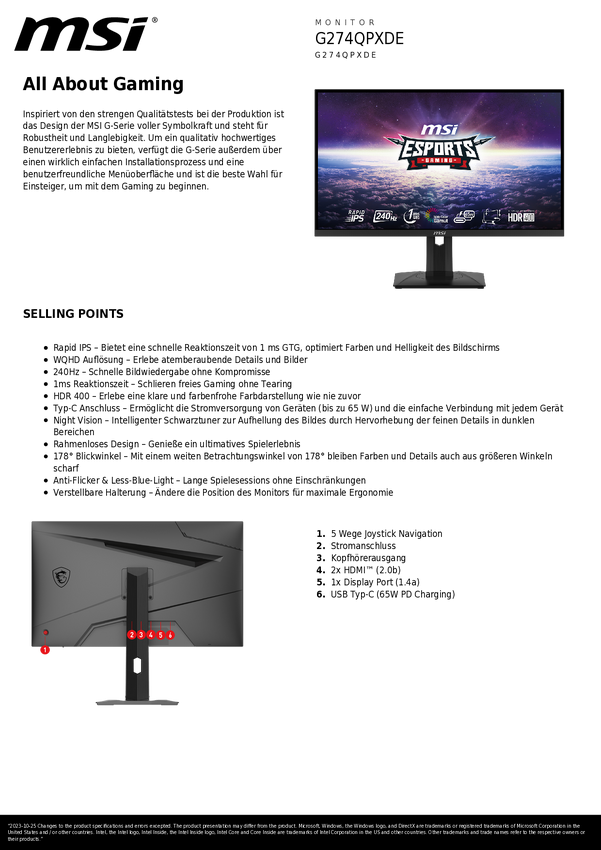 MSI G274QPXDE Monitor EEK F (A - G) 68.6 cm (27 cal) 2560 x 1440 px 16:9 1 ms HDMI, DisplayPort, gniazdo słuchawkowe, US