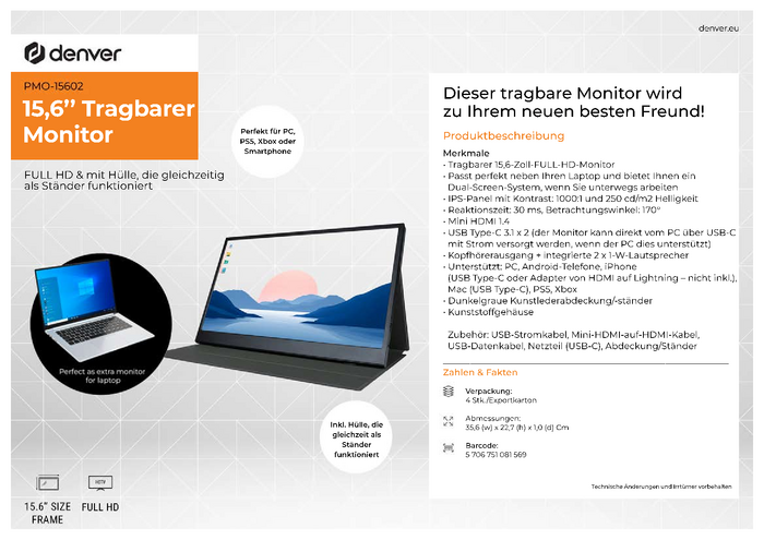 Denver PMO-15602 Monitor EEK C (A - G) 39.6 cm (15.6 cal) 1920 x 1080 px 16:9 USB-C®, Mini HDMI, gniazdo słuchawkowe LCD