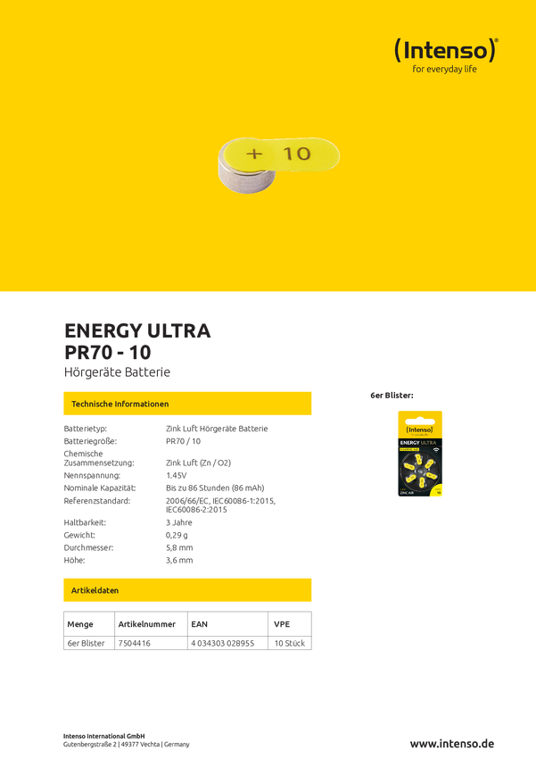 Bateria do aparatu słuchowego PR70-10 Intenso 7504416MP 1.45 V 60 szt. 86 mAh cynkowo-powietrzne