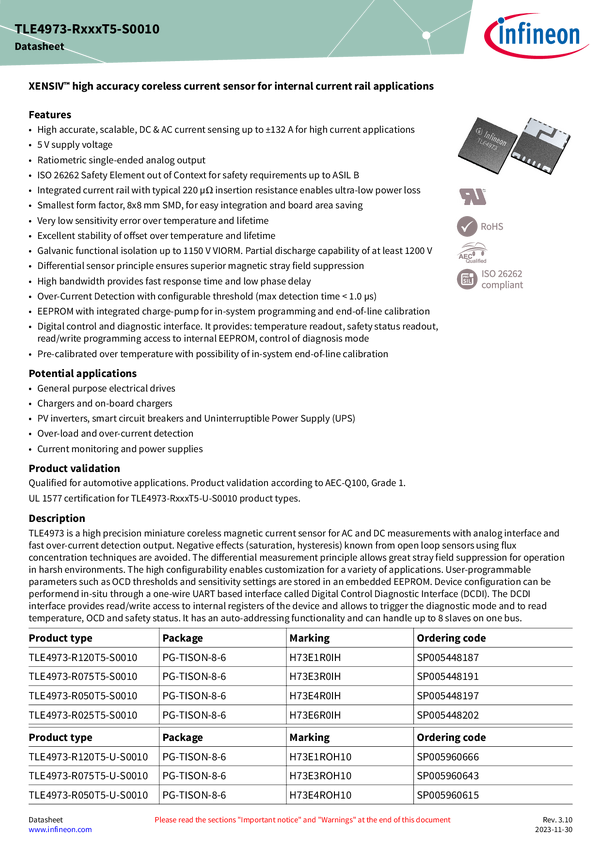 XENSIV™ - TLE4973-R120T5-U-S0010 high accuracy coreless current sensor with digital control and diagnostic interface in TISON package, UL certified device The Infineon XENSIV™ TLE4973-R120T5-S0010 is a current sensor with integrated current rail in 8x 8 mm SMD body which enables optical inspection in the assembly line. This sensor works at 5 V with up to ±132 A measurement range and provides an analog output with over current detection output. Digital control interface provides temperature readout, safety