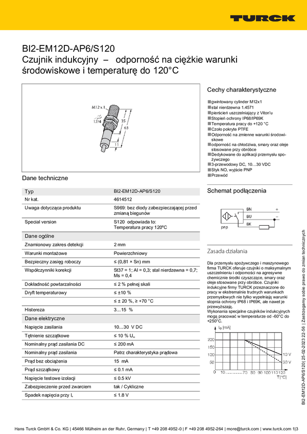 Turck Czujnik indukcyjny nie podtynkowy PNP, Zamykający NI4-EM12D-AP6/S120
