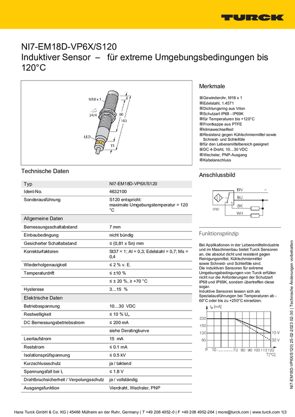 Turck Czujnik indukcyjny nie podtynkowy PNP, Przełącznik NI7-EM18D-VP6X/S120