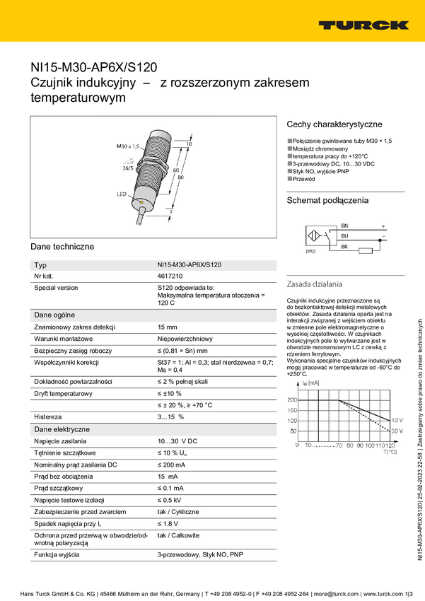 Turck Czujnik indukcyjny nie podtynkowy PNP, Zamykający NI15-M30-AP6X/S120