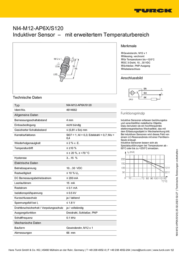 Turck Czujnik indukcyjny nie podtynkowy PNP, Zamykający NI4-M12-AP6X/S120