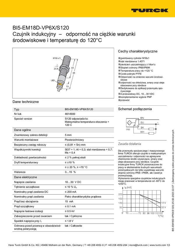 Czujnik indukcyjny Turck BI5-EM18D-VP6X/S120, 10 - 30 V, 1 szt.