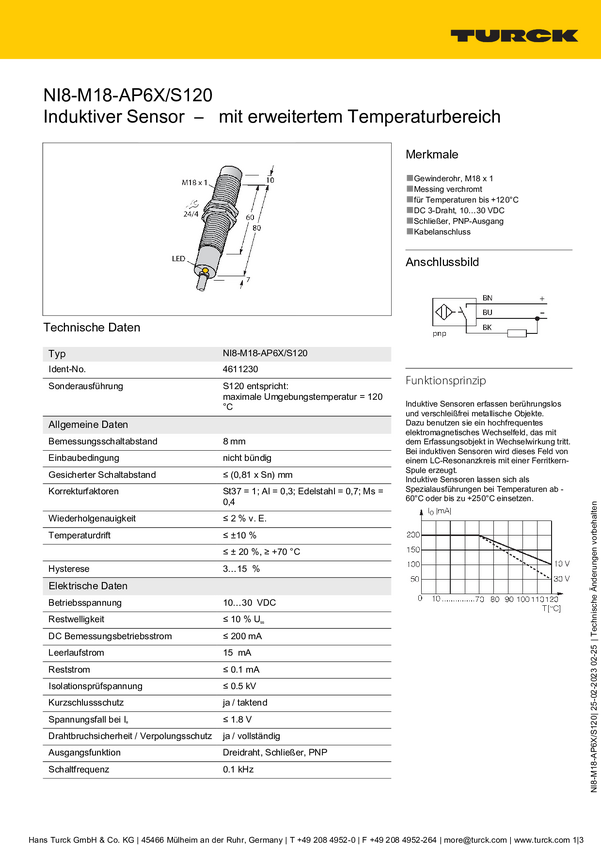 Turck Czujnik indukcyjny nie podtynkowy PNP, Zamykający NI8-M18-AP6X/S120