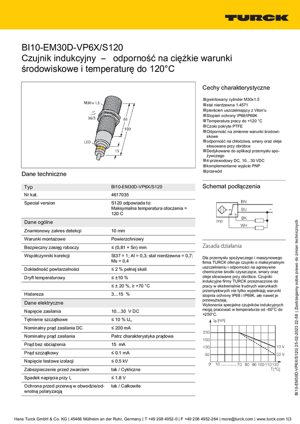 Turck Czujnik indukcyjny podtynkowy PNP, Przełącznik BI10-EM30D-VP6X/S120
