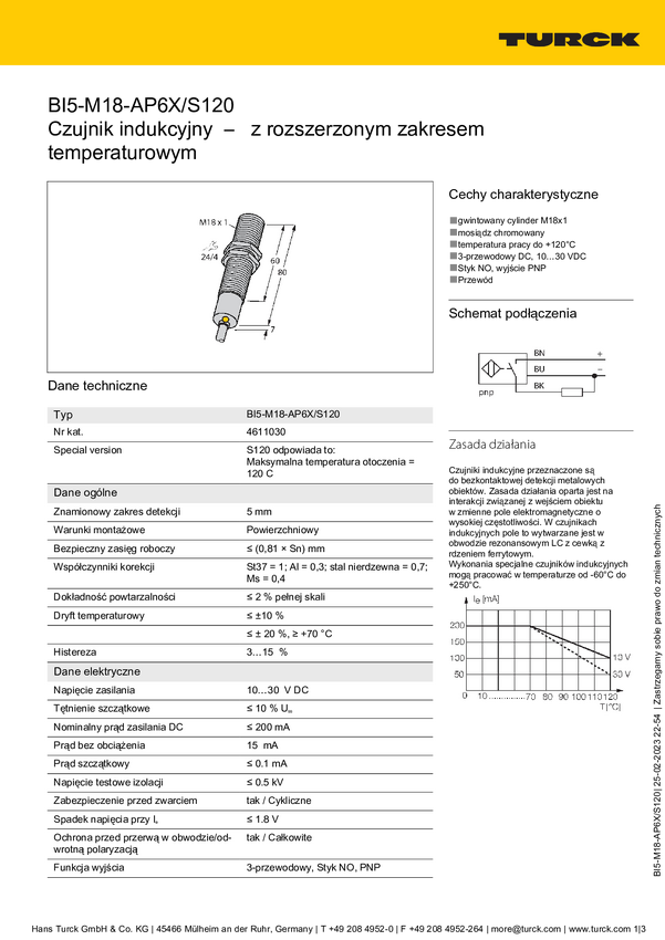 Czujnik indukcyjny Turck BI5-M18-AZ3X/S120, 20 - 250 V, 1 szt.