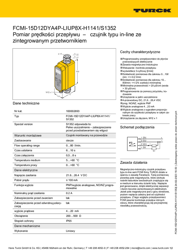 Turck 100002693 Czujnik przepływu FCMI-15D12DYA4P-LIUP8X-H1141/S1352, 1 szt.