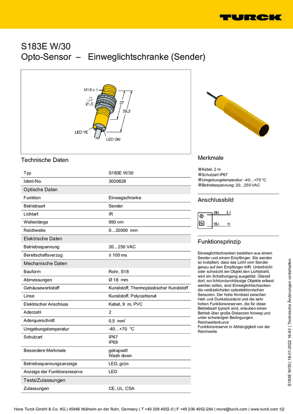 Bezzwrotny czujnik fotoelektryczny Turck S183E W/30 3030828 1 szt.
