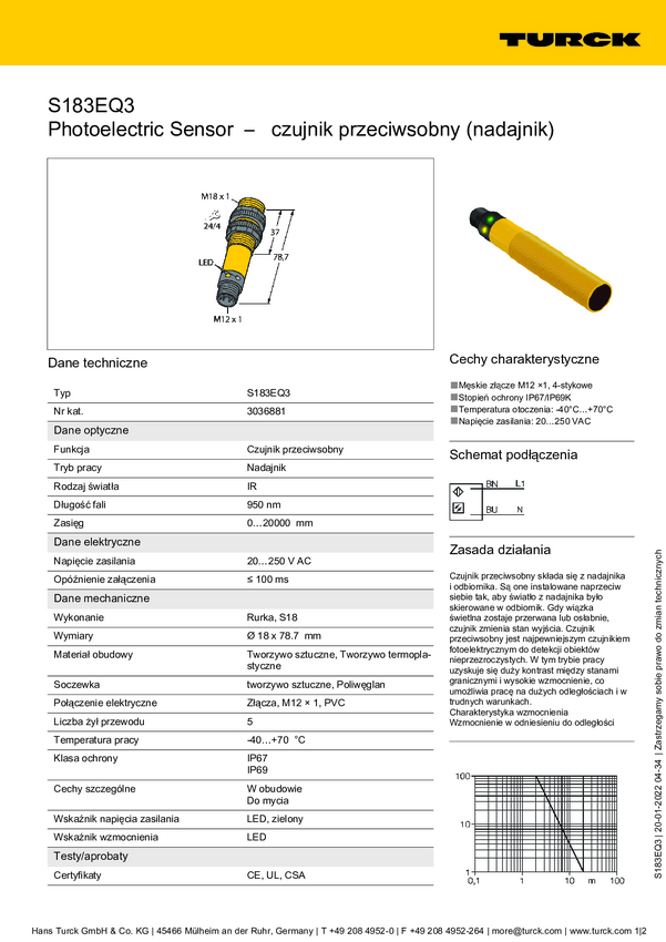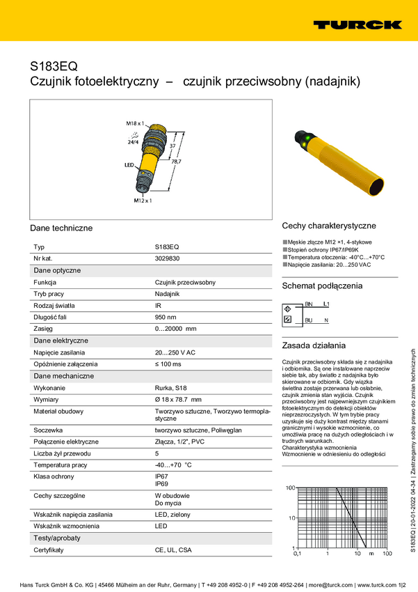 Bezzwrotny czujnik fotoelektryczny Turck S183E 3029823 1 szt.