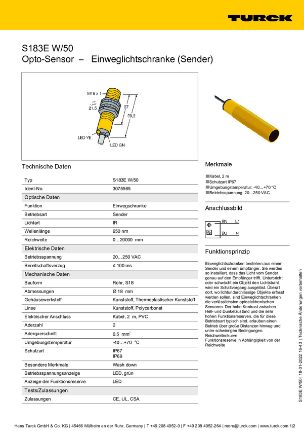 Bezzwrotny czujnik fotoelektryczny Turck S183E W/50 3075565 1 szt.