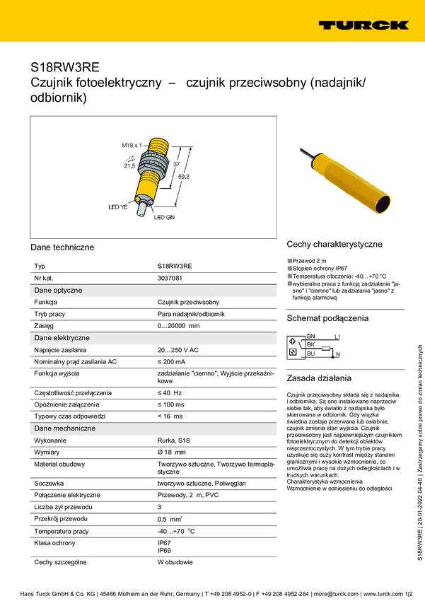 Bezzwrotny czujnik fotoelektryczny Turck S18RW3RE 3037081 przełączanie w ciemności 1 szt.