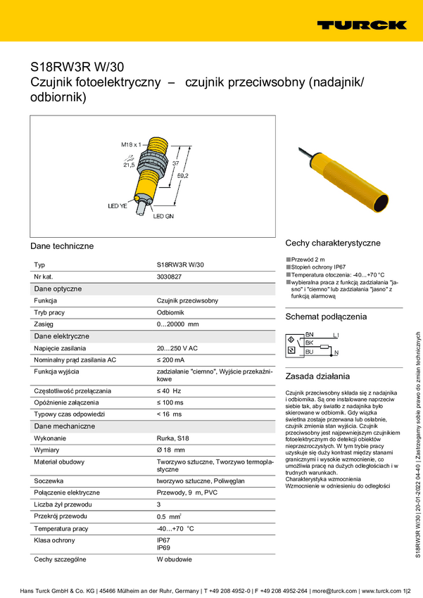 Bezzwrotny czujnik fotoelektryczny Turck S18RW3R W/30 3030827 przełączanie w ciemności 1 szt.
