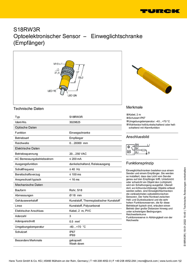 Bezzwrotny czujnik fotoelektryczny Turck S18RW3R 3029825 1 szt.