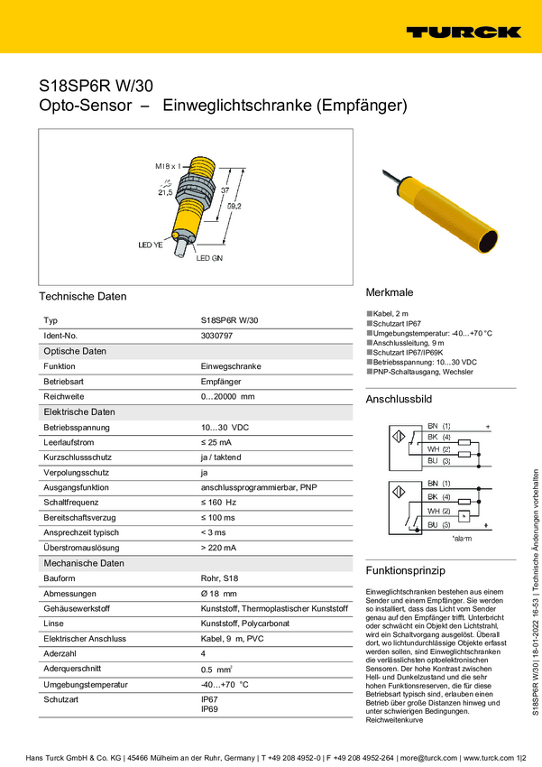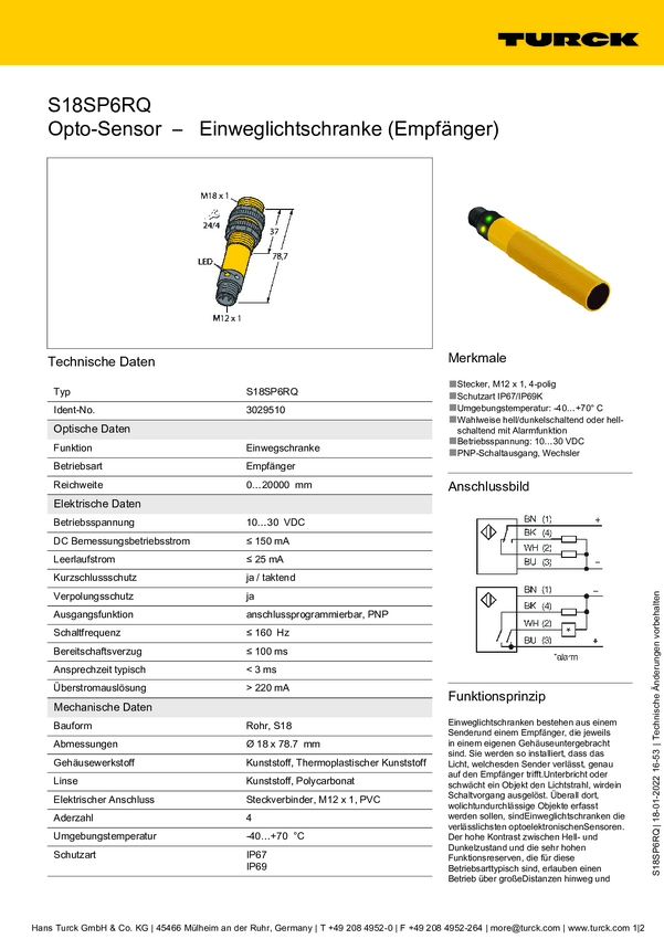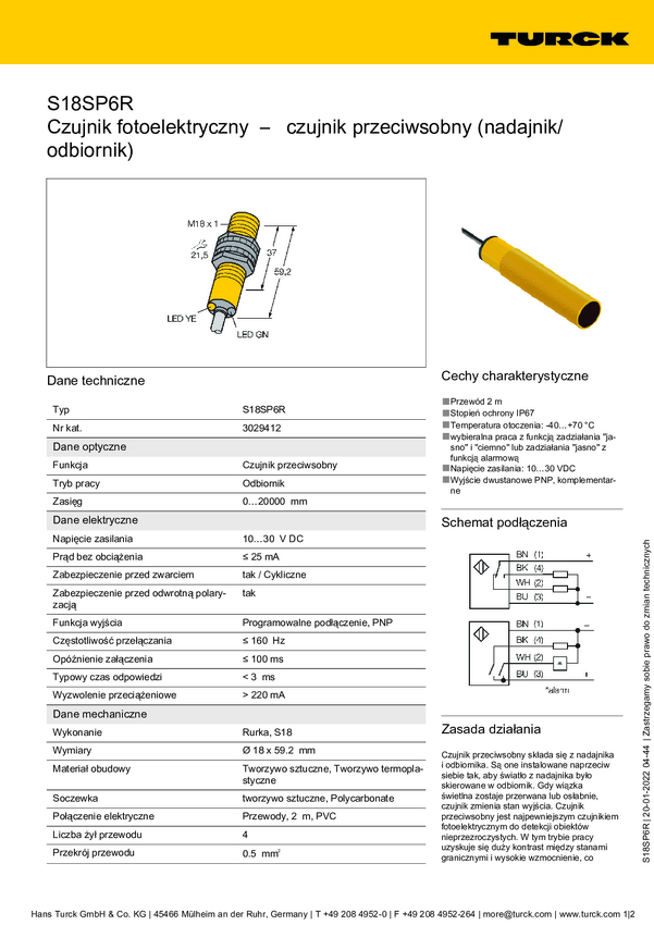 Bezzwrotny czujnik fotoelektryczny Turck S18SP6R 3029412 1 szt.