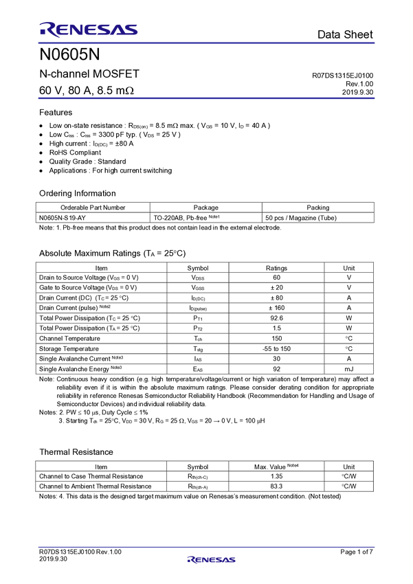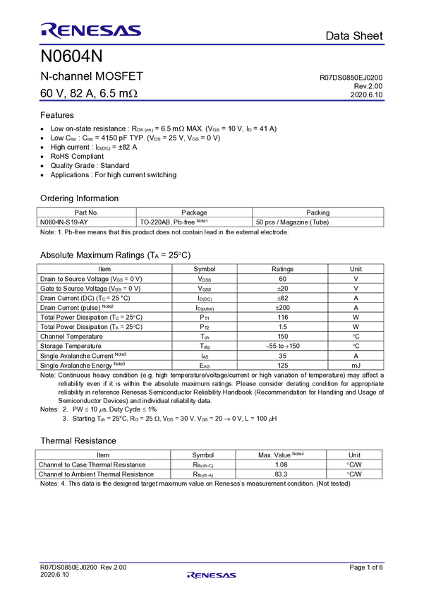 Nch Power MOSFET 60V 82A 6.5mohm TO-220