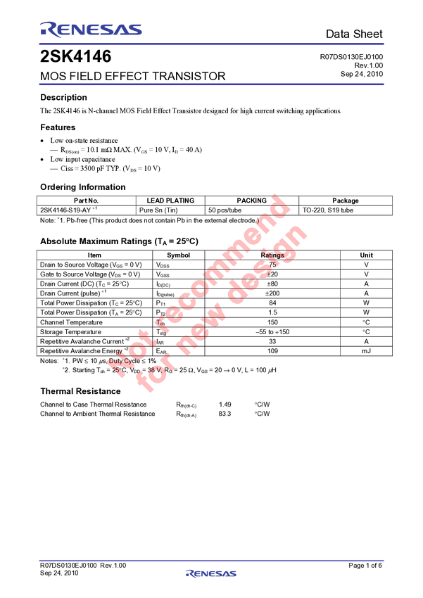 Nch Power MOSFET 60V 100A 4.6mohm TO-220