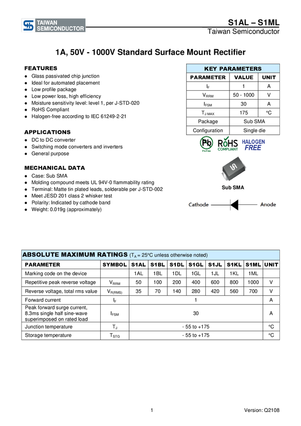 Taiwan Semiconductor Dioda prostownicza 1 mA S1GAL Pojedynczy taśma