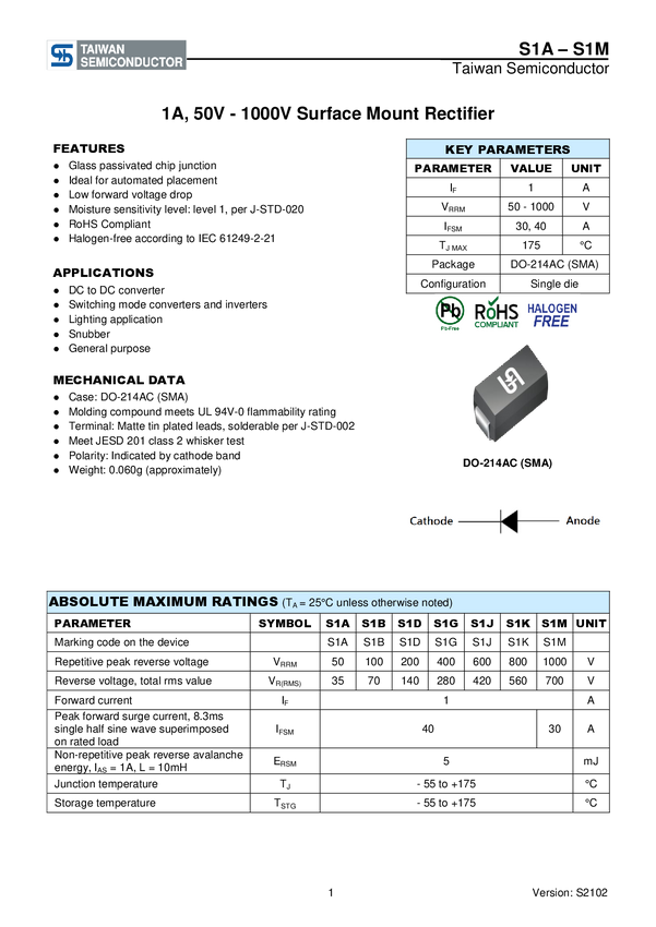 Taiwan Semiconductor Dioda prostownicza 1 mA S1GM Pojedynczy taśma na dużej rolce