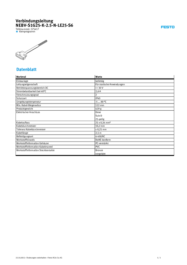 FESTO 575417 Kabel połączeniowy czujnika/aktuatora NEBV-S1G25-K-2.5-N-LE25-S6, piny: 25, 2.50 m, 1 szt.