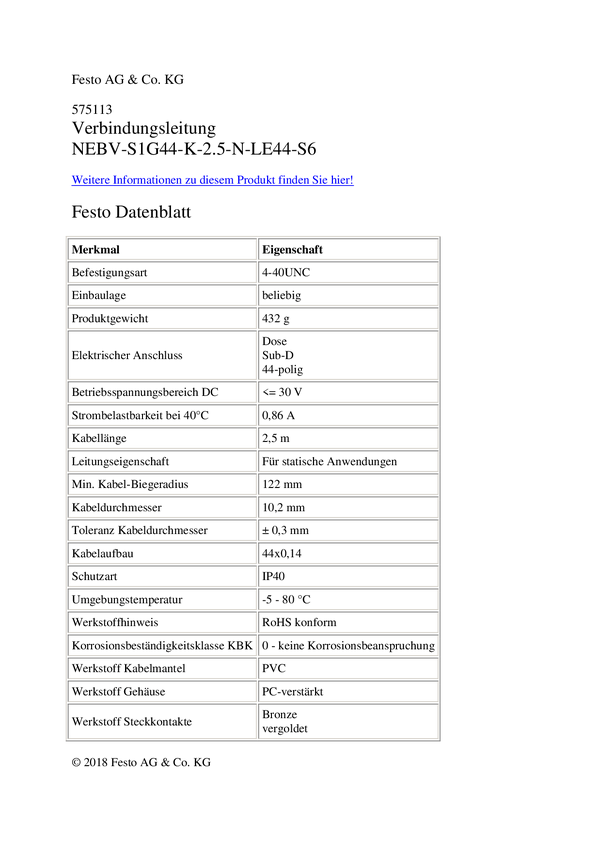FESTO 575113 Kabel połączeniowy czujnika/aktuatora NEBV-S1G44-K-2.5-N-LE44-S6, piny: 44, 2.50 m, 1 szt.
