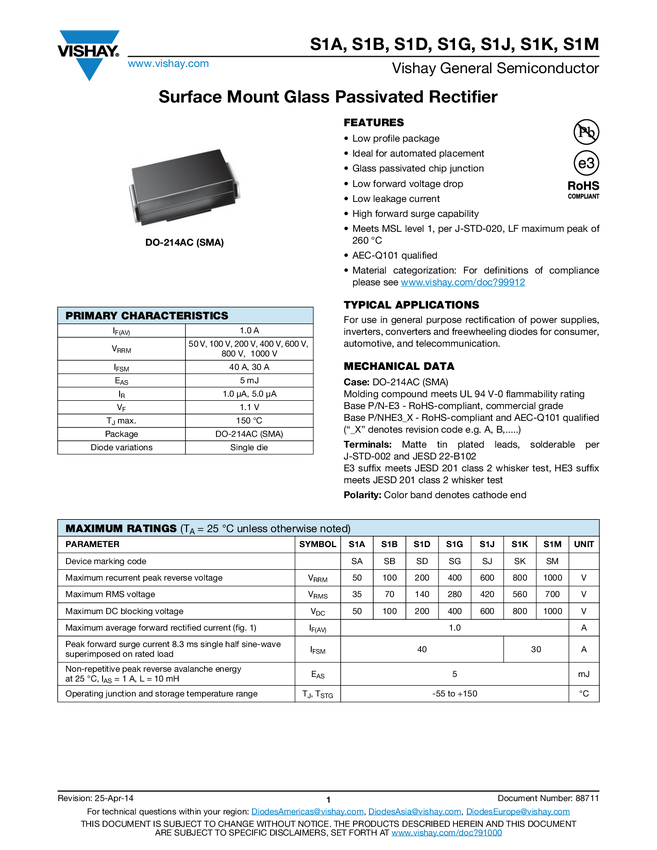 1.2 A, 1000 V Surface Mount Rectifiers