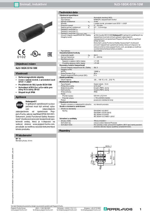 Pepperl+Fuchs Czujnik indukcyjny NAMUR NJ3-18GK-S1N-10M 123G1x3D