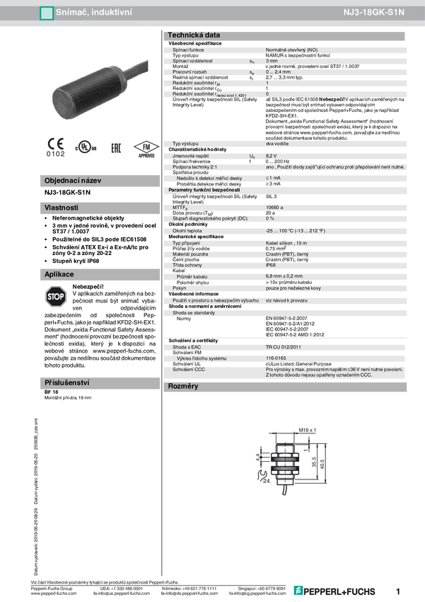 Pepperl+Fuchs Czujnik indukcyjny NAMUR NJ3-18GK-S1N 123G1x3D
