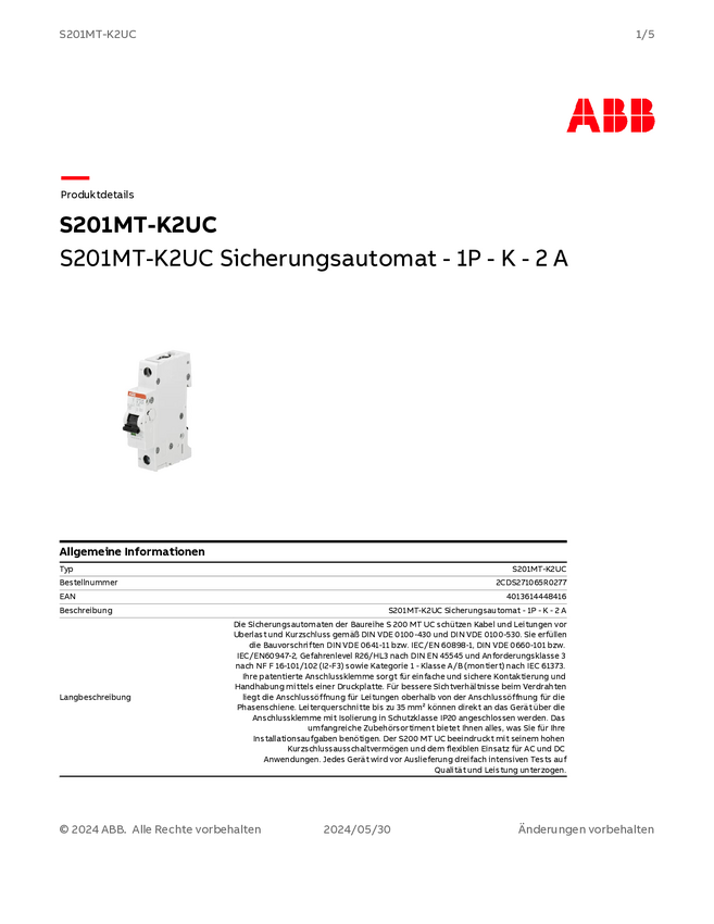 Wyłącznik automatyczny ABB S201MT-K2UC 2CDS271065R0277, 1 styk