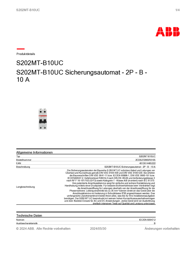 Wyłącznik automatyczny ABB S202MT-B10UC 2CDS272065R0105, 2 styki