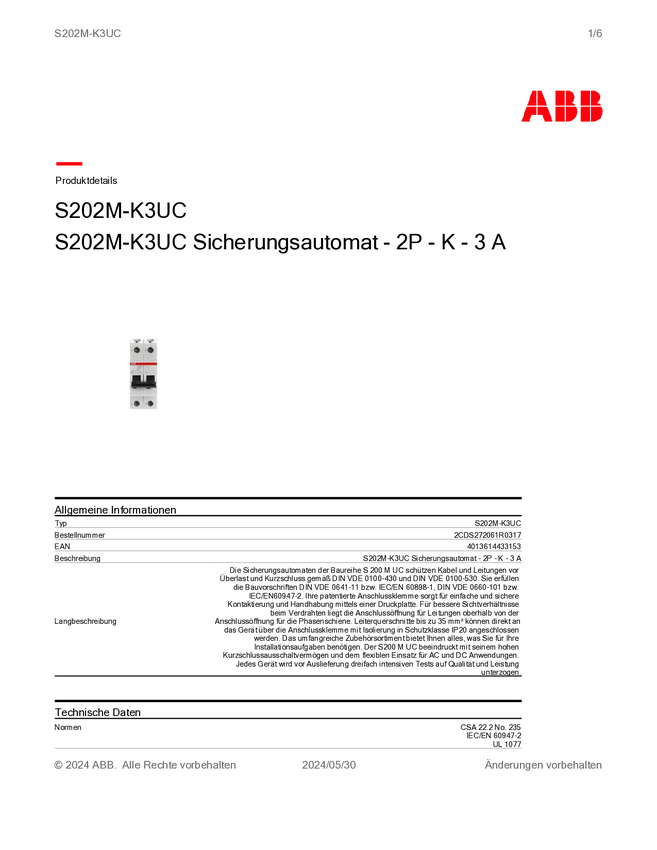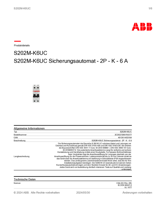 ABB 2CDS272061R0377 S202M-K6UC Wyłącznik automatyczny 2 styki
