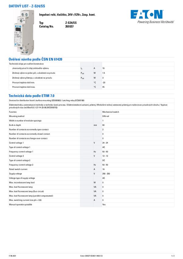 Eaton 265537 Przełącznik przepięciowy Z-S24/SS, 16 A