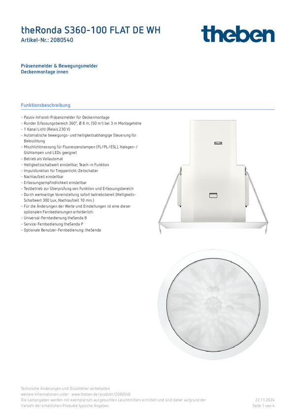 Detektor obecności Theben 2080540 theRonda S360-100 FLAT DE WH