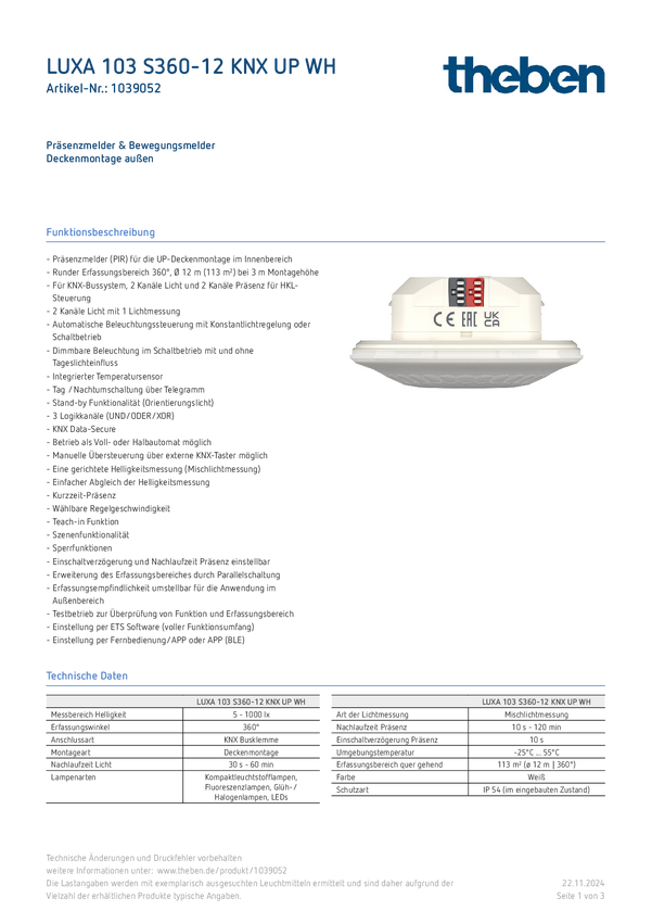 Detektor obecności Theben 1039052 LUXA 103 S360-12 KNX UP