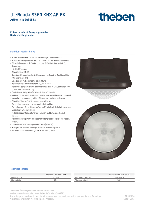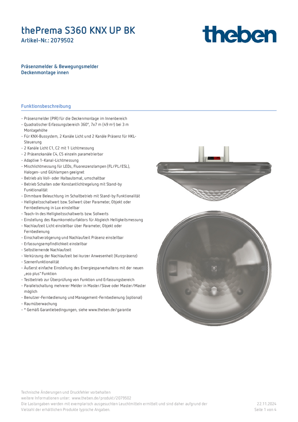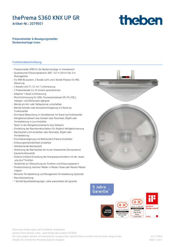 Detektor obecności Theben 2079501 thePrema S360 KNX UP GR