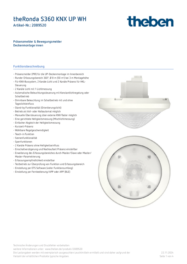 Detektor obecności Theben 2089520 theRonda S360 KNX UP WH