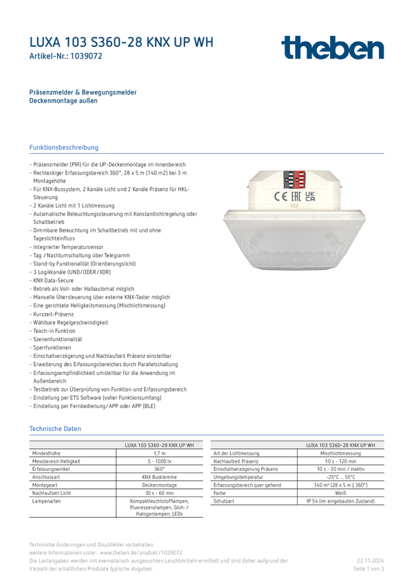Detektor obecności Theben 1039072 LUXA 103 S360-28 KNX UP