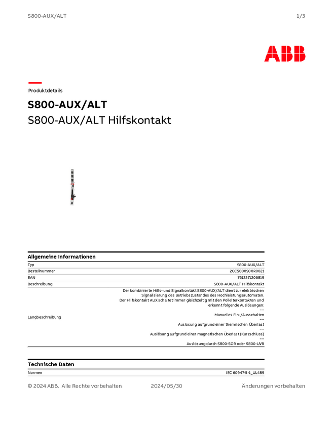 Przełącznik pomocniczy ABB S800-AUX/ALT 2 NC 1 szt.
