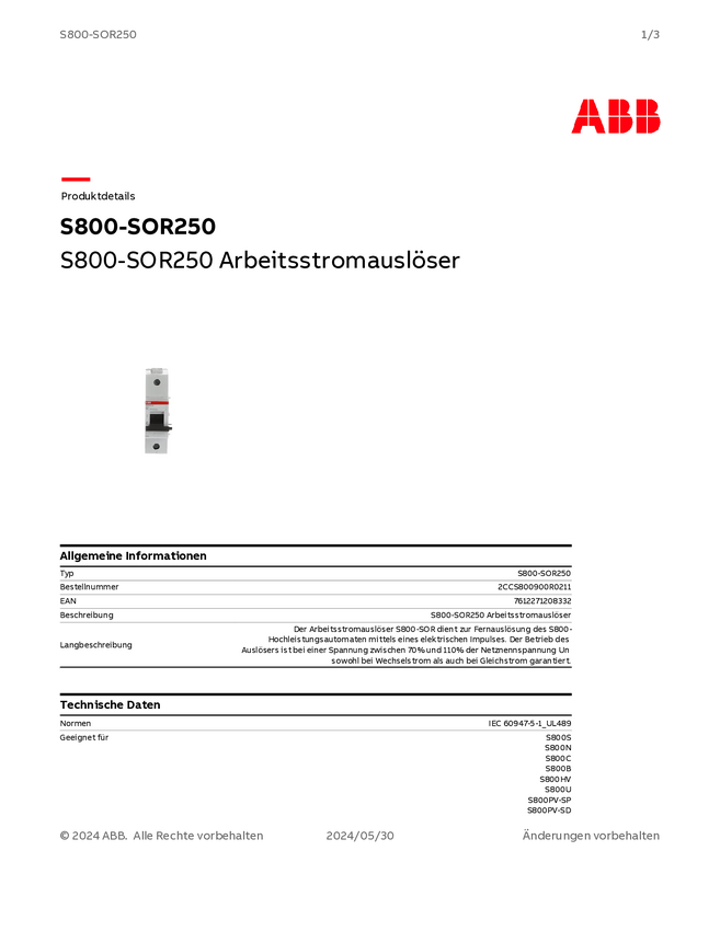 Wyłącznik zasilania ABB S800-SOR250 1 NO 1 szt.